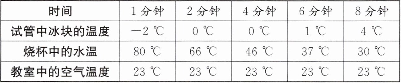 科学小组为了研究冰的熔化现象,做了如下实验:取一支装有冰块的试管,在冰面处绑上橡皮筋,然后将试管浸在热水里,观察试管中冰的熔化过程,并用温度计测量温度。下表中是记录的相关数据。