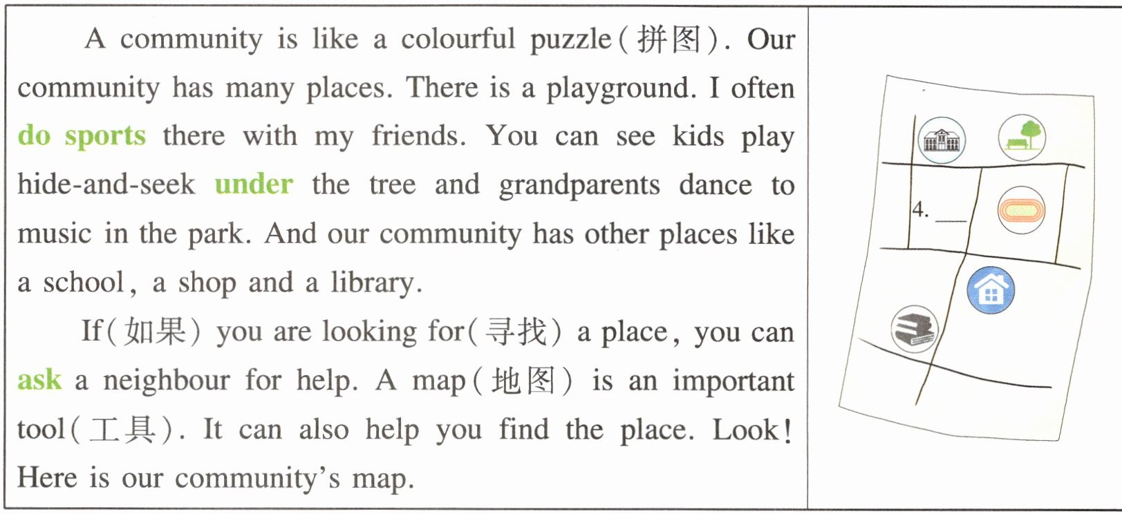 | A community is like a colourful puzzle (拼图). Our community has many places. There is a playground. I often do sports there with my friends. You can see kids play hide-and-seek under the tree and grandparents dance to music in the park. And our community has other places like a school, a shop and a library. If (如果) you are looking for (寻找) a place, you can ask a neighbour for help. A map (地图) is an important tool (工具). It can also help you find the place. Look! Here is our community's map. | |