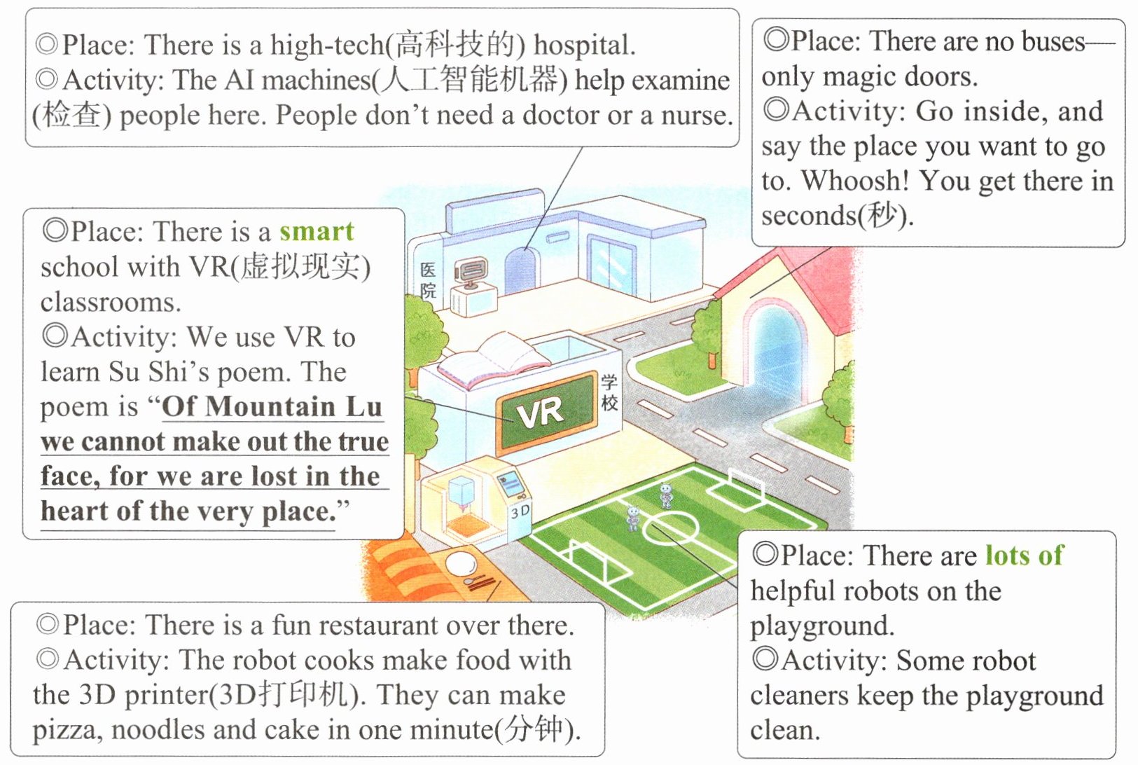 ○Place: There is a smart school with VR(虚拟现实) classrooms.