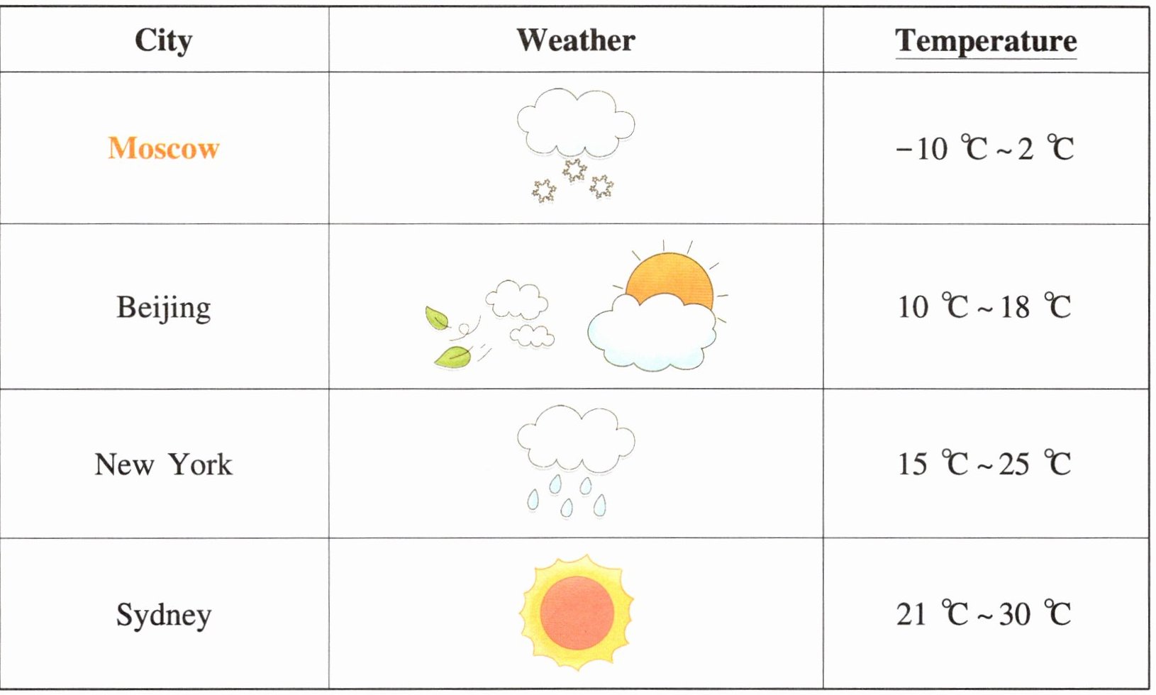 1. A 【细节理解题】由天气预报中 City 一列的 Moscow、Beijing、New York 和 Sydney 可知,我们在这个天气预报中可以看到 4 个城市。