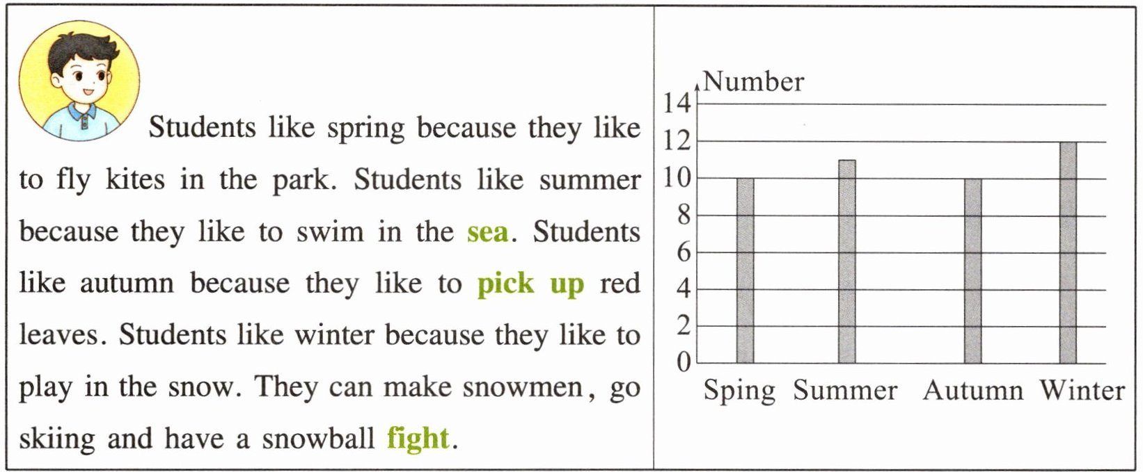 | Students like spring because they like to fly kites in the park. Students like summer because they like to swim in the sea. Students like autumn because they like to pick up red leaves. Students like winter because they like to play in the snow. They can make snowmen, go skiing and have a snowball fight. | |