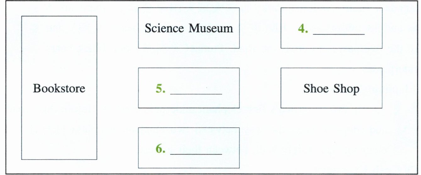 二、4. C 【推理判断题】由短文中的“...science museum...is between the bookstore and the library.”可知,科学博物馆在书店和图书馆之间。由此可推知,此横线处为图书馆。