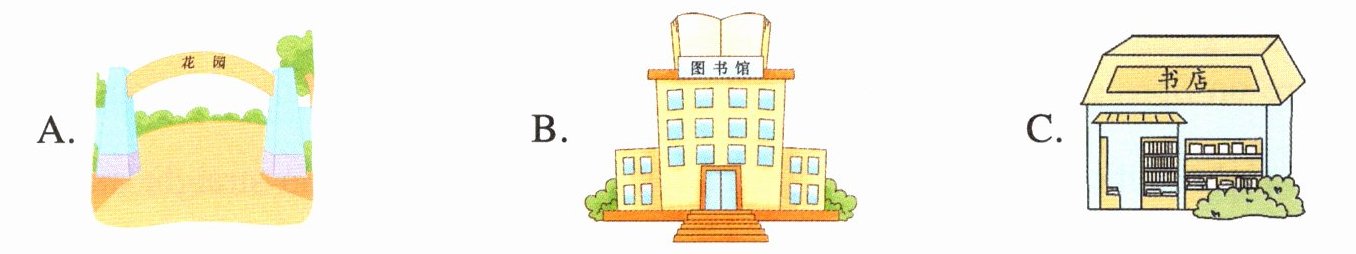 | school | garden | ① | bookstore | ② shop | restaurant |