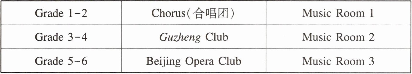 | Grade 1-2 | Chorus(合唱团) | Music Room 1 |