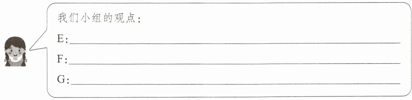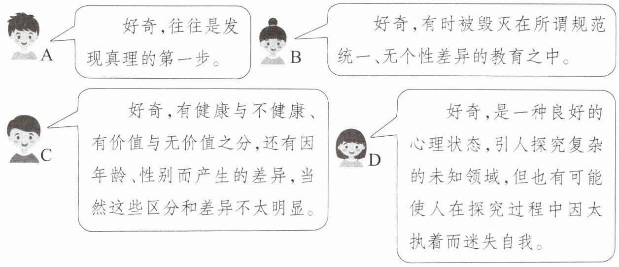 (1) 请先阅读A、B、C、D四名同学的观点陈述,分析这些观点分别是从哪个角度来谈好奇心的,然后在E、F、G中记录下其他同学的观点,判断谁的观点表述是明确的。