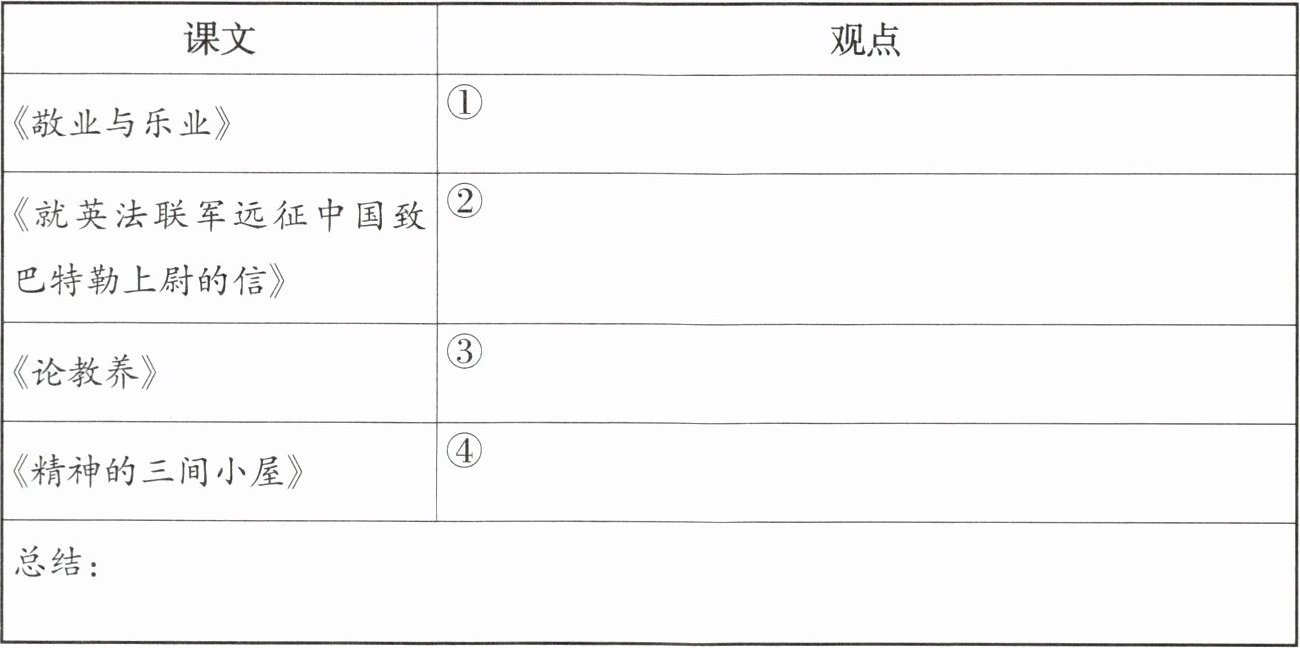 ①“敬业乐业”四个字是人类生活的不二法门 ②谴责英法联军侵略中国、劫掠毁灭圆明园的罪行,同情遭受劫难的中国 ③一个有教养的人,必定从心里愿意尊重别人,也善于尊重别人 ④构建自己的精神世界 总结:①用一个明确的判断句来表述,如“……是……”“……要/应当/必须……”“……能够/将会……”;②论说范围明确;③语言较简洁