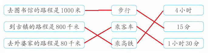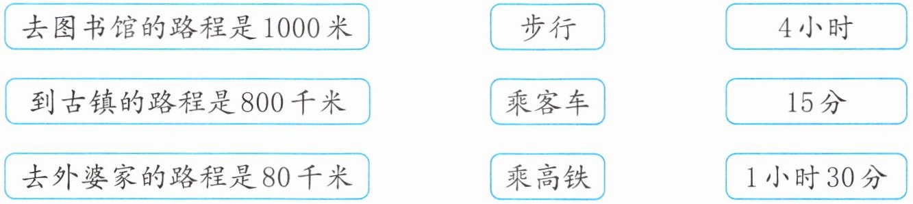 2. 根据提供的出行信息,选择合适的出行方式和所需的时间,并连一连。