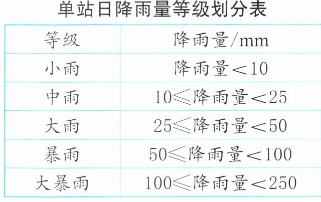 4. 右面是单站日降雨量等级划分表。某气象站一天测得降雨量是15厘米。这次降雨属于哪个等级?