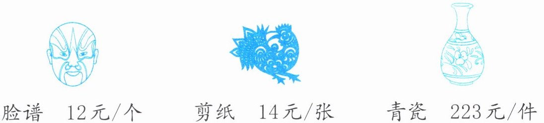 (2)已知剪纸的单价是14元,数量是1张;青瓷的单价是223元,数量是3件。