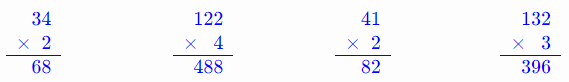 $\begin{array}{r} 34\\ ×\ \ 2\\ \hline 68\end{array}$