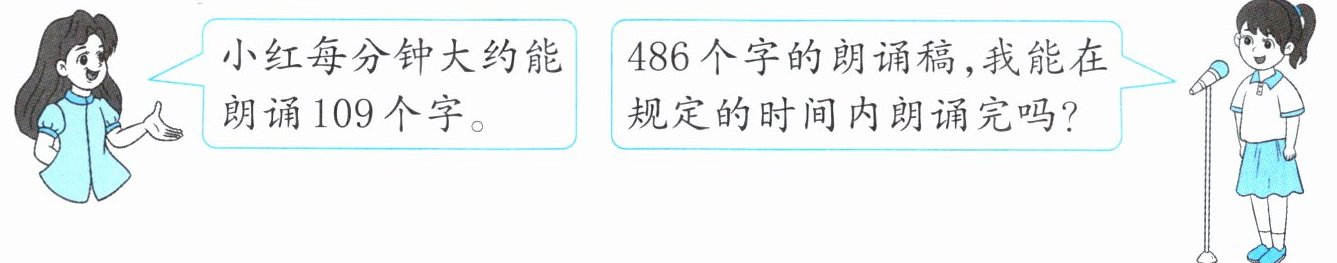 解析:本题考查三位数乘一位数的估算在实际问题中的应用,通过估算小红在规定时间内朗诵的字数,再与朗诵稿的总字数比较,从而判断能否朗诵完。