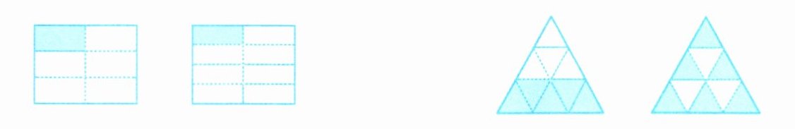 第三个图:把一个大三角形平均分成$9$份,涂色部分占了$5$份,用分数表示为$\frac{5}{9}$。