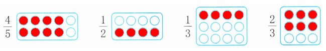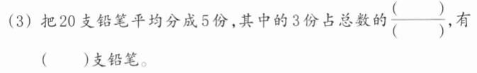 (3)把$20$支铅笔平均分成$5$份,每份是$20 ÷ 5=4$支,其中的$3$份占总数的$\frac{3}{5}$,有$4 × 3=12$支。