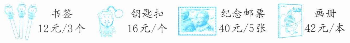 (1) 每张纪念邮票比每个钥匙扣便宜多少钱?