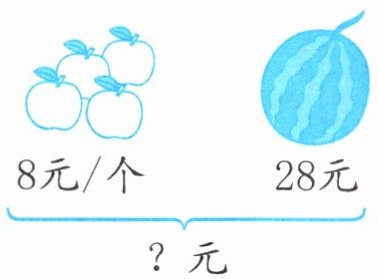 解析:本题考查混合运算,考查对图文的理解及混合运算能力。从图中可知,苹果每个$8$元,有$4$个,西瓜$28$元,要求总共花费多少钱,需要先算出苹果的总价,再加上西瓜的价格。