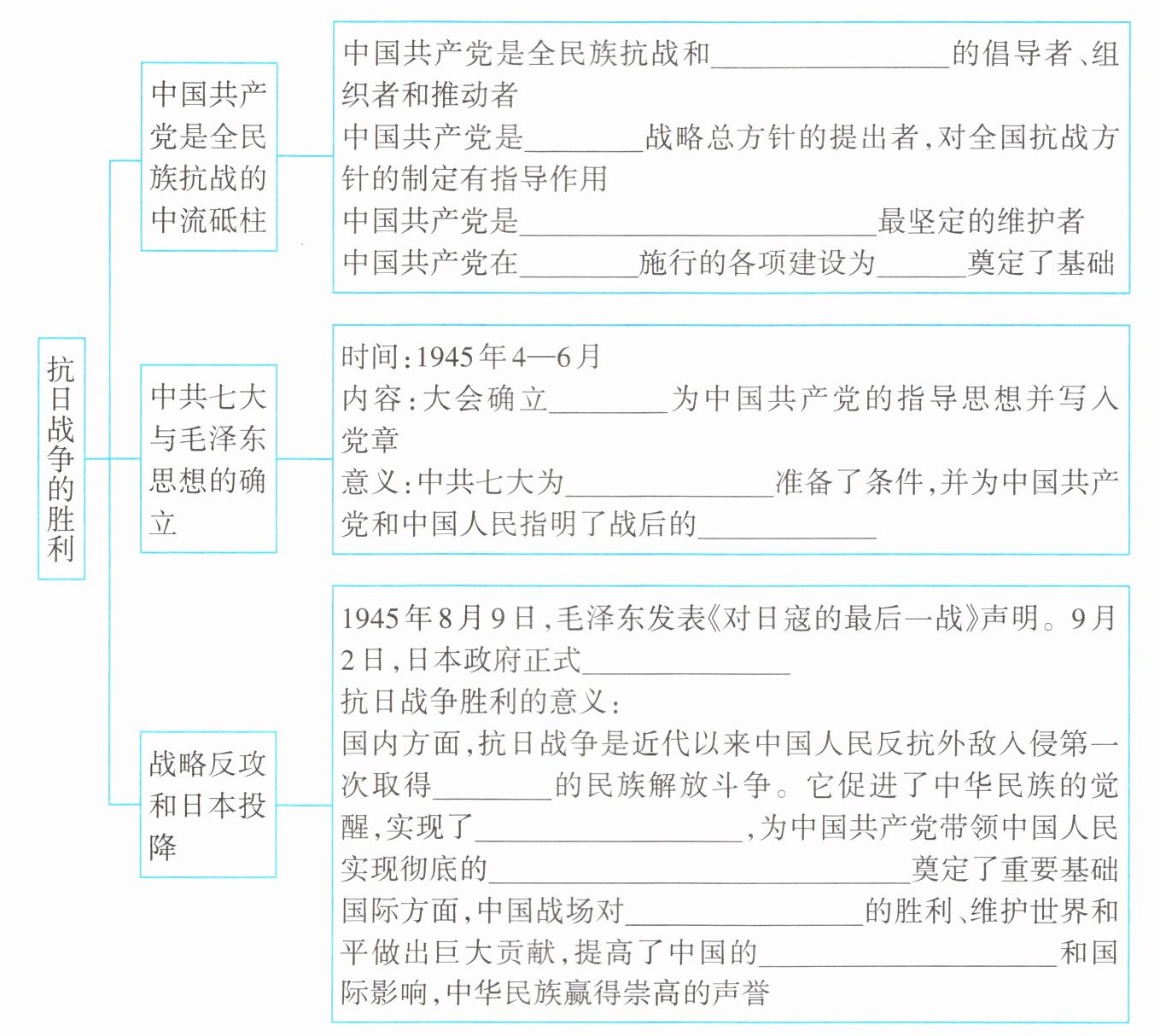 抗日民族统一战线;持久战;全民族团结抗战;抗日根据地;抗战胜利;毛泽东思想;争取抗日的最后胜利;奋斗方向;签署投降书;完全胜利;中华民族的大团结;民族独立和人民解放;世界反法西斯战争;国际地位