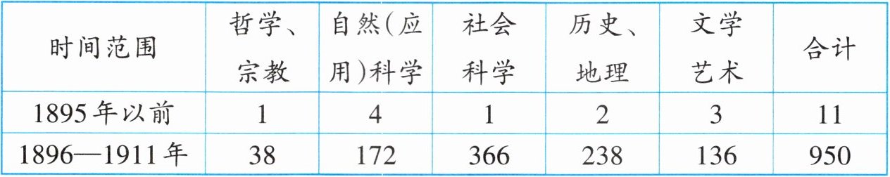 材料二 近代中国翻译的部分日本书籍数量统计表(单位:本)。