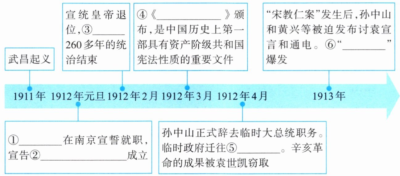 ①孙中山 ②中华民国临时政府 ③清朝 ④中华民国临时约法 ⑤北京 ⑥二次革命