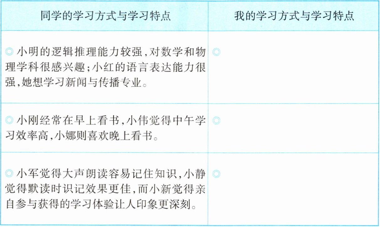 (1)请比较下列同学的学习方式与学习特点,分析你的学习方式和学习特点。
