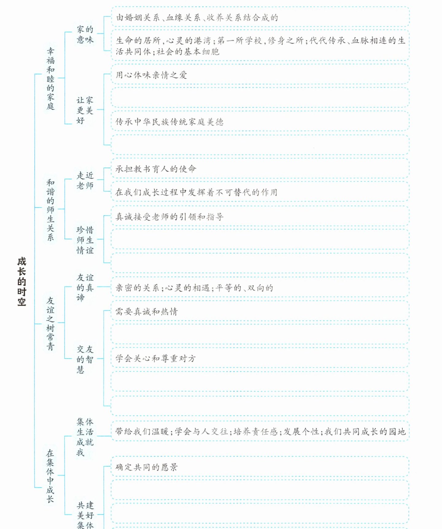 相互关爱、彼此尊重 家庭成员的共同责任 正确对待老师的表扬和批评 尊重并适应不同风格的老师 需要慎重选择 学会处理朋友之间的矛盾和冲突 需要讲原则 树立主人翁意识 营造和谐有序的集体环境 坚持集体主义原则,发扬集体主义精神
