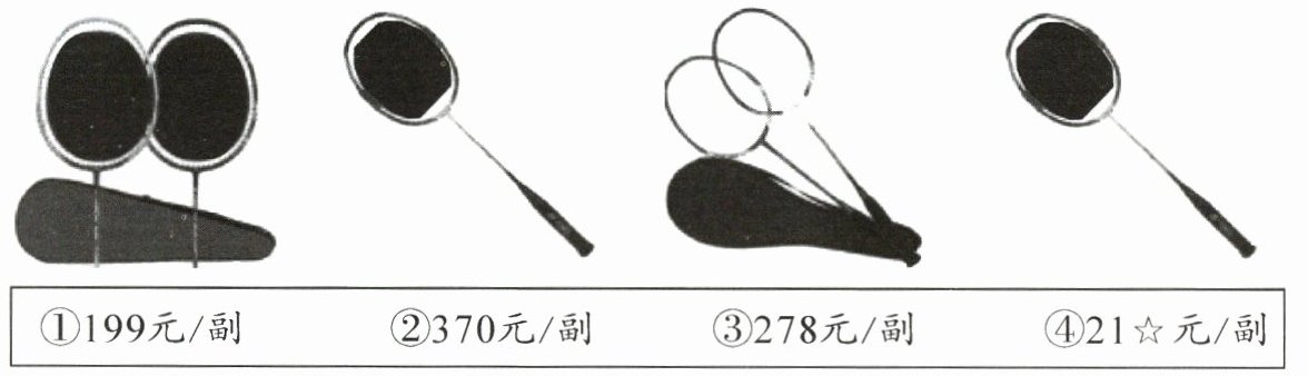 1. 学校羽毛球集训队要新购一批羽毛球拍,王教练在商店看到以下四款羽毛球拍,其中第④款羽毛球拍的单价看不清。