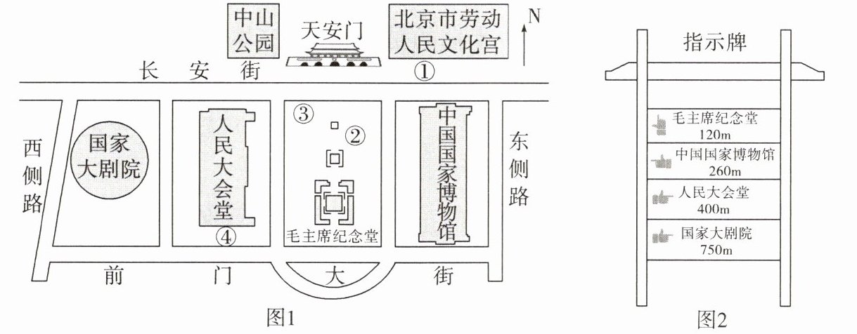 明明同学一家去北京旅游,并在天安门广场拍照留念。下面为天安门周边平面示意图(图1)和某地的指示牌(图2)。据此回答第6、7题。