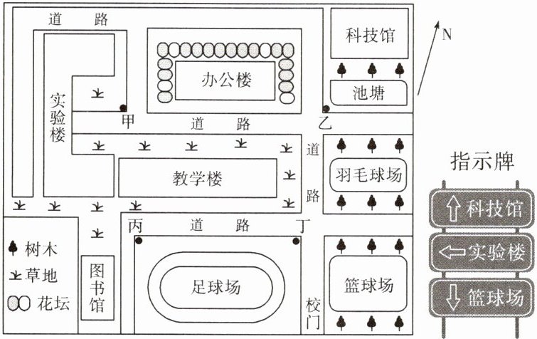 某中学地理兴趣小组通过开展地理绘图活动,绘制了校园平面图。下面为该中学地理兴趣小组绘制的校园平面图和校内某指示牌。读图,回答第4、5题。