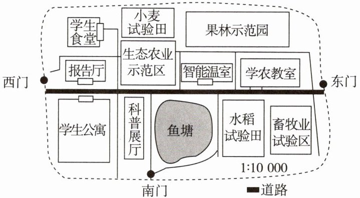 方向。(3分)(3)学农教室和学生公寓的图上距离约为5厘米,则其实地距离约为
