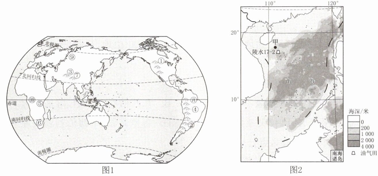 。(1分)(5)描述材料二中油气田附近甲处的海底地形类型,并根据图2说明陵水17-2油气田开发面临的困难。(3分)