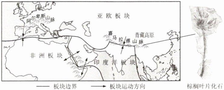 我国古生物学家在青藏高原地区发现了距今约2500万年的棕榈叶片化石。现存的棕榈科植物主要分布在热带和亚热带地区。下面为板块分布示意图(局部)和棕榈叶片化石图。据此回答第6—8题。