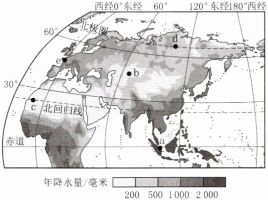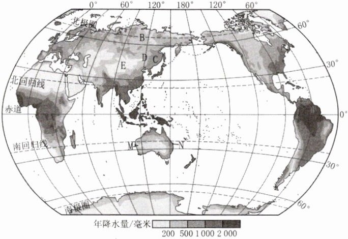 (3)从A处向北到B处,年降水量逐渐______;C、D、E三处相比,降水量最多的是______(填字母)处,降水量最少的是______(填字母)处。(3分)