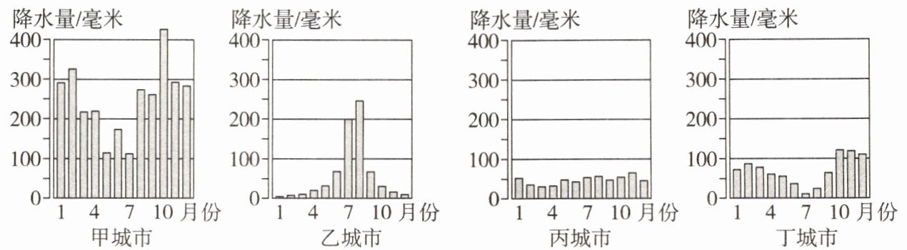 世界各地降水量的分布是不均匀的,下图为北半球四个城市多年平均各月降水量柱状图。据此回答第8、9题。
