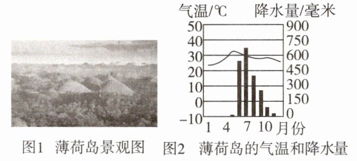 位于亚洲东南部的菲律宾薄荷岛中部丘陵上的草在雨季时为绿色,旱季时被炎热的太阳晒干变成咖啡色,酷似巧克力,因此得名“巧克力山”。据此回答第10、11题。