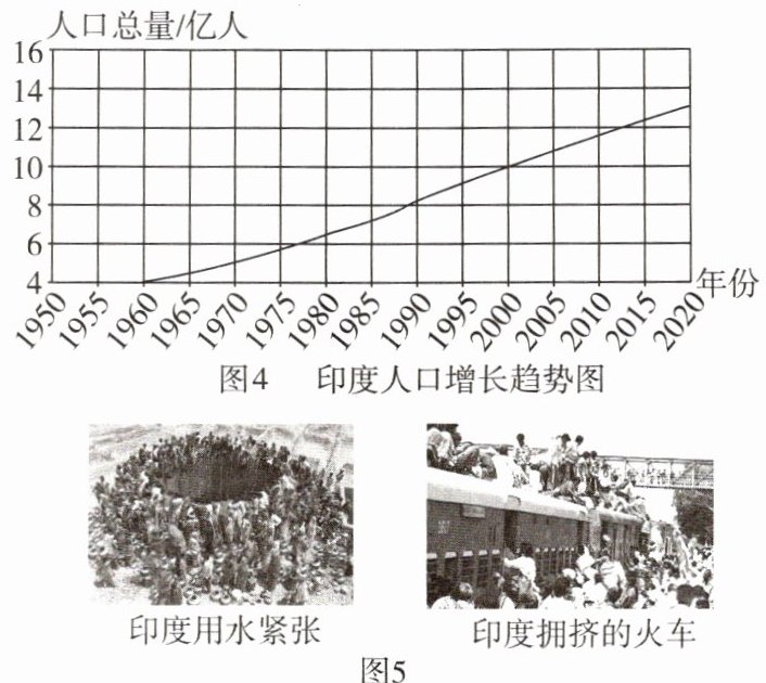 (3)根据图4可以得知印度人口的哪些主要信息?根据图5说明印度人口发展带来的影响。(4分)