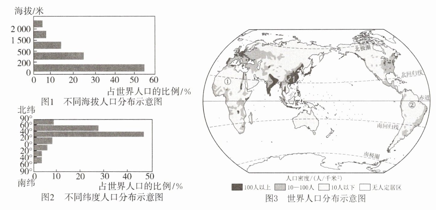 (地形类型);由图2可知,世界人口大部分位于北半球降水较多、气候温和的中纬度和______低