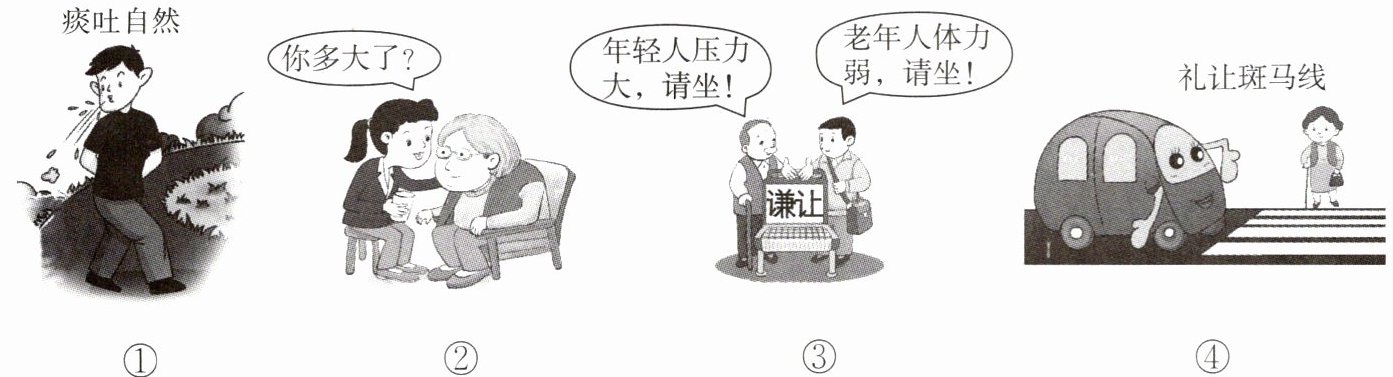 (注:①图内容为“痰吐自然”;②图内容为“你多大了?”;③图内容为“年轻人压力大,请坐!老年人体力弱,请坐!”;④图内容为“礼让斑马线”)