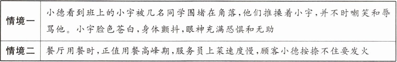|情境一|小德看到班上的小宇被几名同学围堵在角落,他们推搡着小宇,并不时嘲笑和辱骂他。小宇脸色苍白,身体颤抖,眼神充满恐惧和无助|