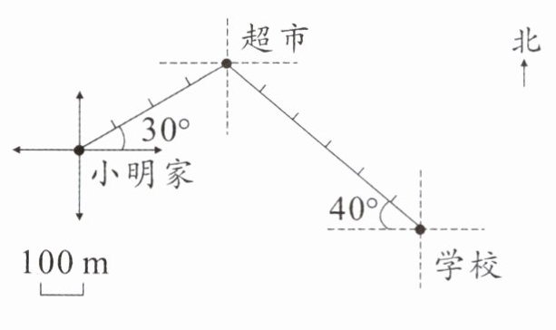 | 超市→小明家 | 西偏南30° | 400m | 8分钟 |