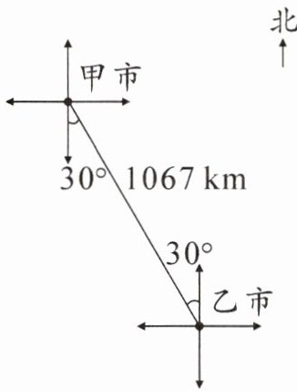 2.乙市在甲市的南偏东$30^{\circ}$方向上,距离是$1067$千米。