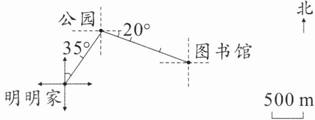 1. 明明从家出发,向北偏东35°方向行走1000m到达公园,再从公园向东偏南20°方向行走1500m到达图书馆。