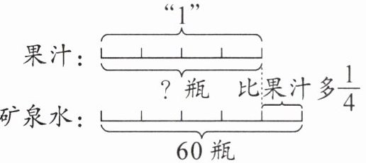 选项A:$(1 + \frac{1}{4})x = 60$,该方程表示果汁的瓶数加上果汁瓶数的$\frac{1}{4}$等于$60$瓶,因为矿泉水比果汁多$\frac{1}{4}$,所以该方程正确。