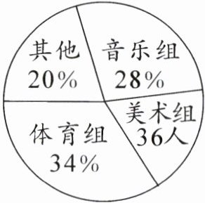 1. 从扇形统计图中可以看出各小组人数占总人数的百分比,其中体育组占比$34\%$,音乐组占比$28\%$,其他组占比$20\%$,而美术组人数是$36$人,占比为:$1 - 34\% - 28\% - 20\% = 18\%$。