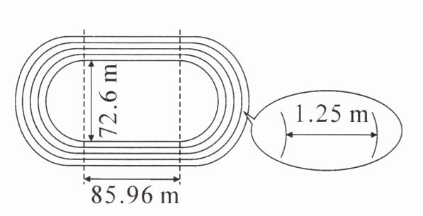 四、【拓展题】下面右边是某校新建成的塑胶跑道,直跑道长85.96 m,第一条半圆形跑道内圈的直径为72.6 m,每条跑道宽1.2 m。