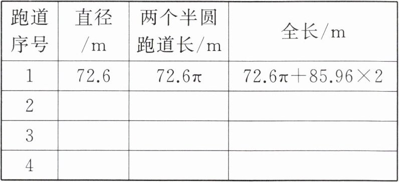 )m。| 跑道序号 | 直径/m | 两个半圆跑道长/m | 全长/m |