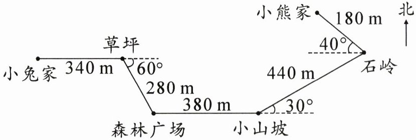 (1)小兔从家出发,先向正东方向走$340m$到达草坪,再从草坪向南偏东$60^{\circ}$方向走$280m$到达森林广场,接着从森林广场向正东方向走$380m$到达小山坡,然后从小山坡向北偏东$30^{\circ}$方向走$440m$到达石岭,最后从石岭向北偏西$40^{\circ}$方向走$180m$到达小熊家。