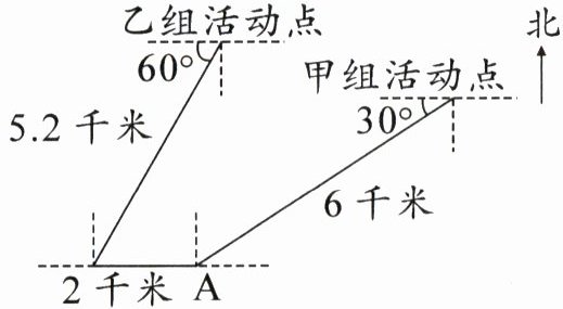 (1)乙组从$A$地出发,先向正北方向走$2$千米,再向北偏东$60^\circ$方向走$5.2$千米到达活动点。