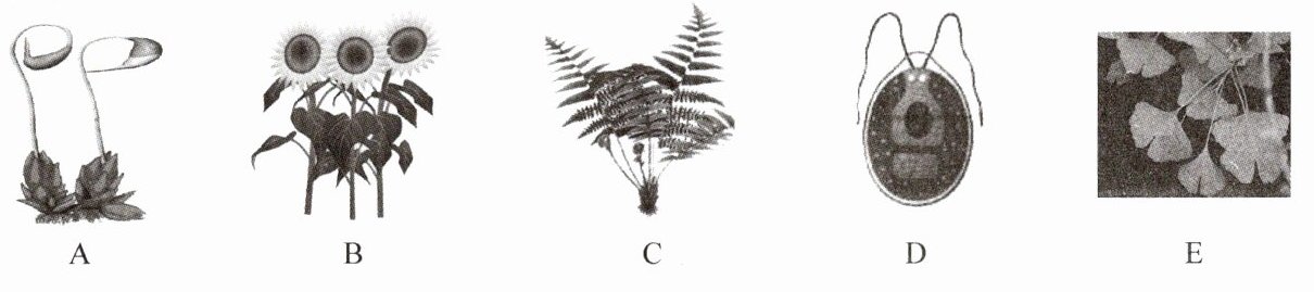 18. 小明和爸爸到郊区采集了一些植物标本(如图),但回家后发现标本的号牌从标本上掉下来了。他通过仔细回忆,想起了一些线索:1号标本是在一个池塘里采集的;2号和3号是在一个向阳的山坡上采集的;4号和5号是在一个山谷中比较阴暗潮湿的地方采集的。爸爸还告诉他:2号、3号和4号标本都有根;2号标本有果实。请你帮小明将标本的号牌挂上去。(填字母)
