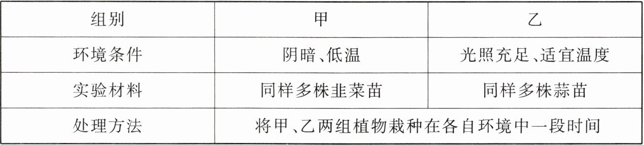 (1)3 (2)①阴暗、适宜的温度 光照充足、适宜的温度 ②同样的材料(同样多株韭菜苗或同样多株蒜苗) (3)白色或黄白色
