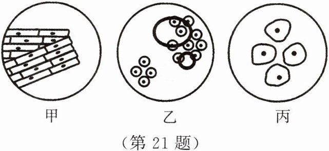 21. 如图所示为制作并观察洋葱鳞片叶内表皮细胞及人口腔上皮细胞临时装片时显微镜下观察到的三个视野。请据图回答下列问题: