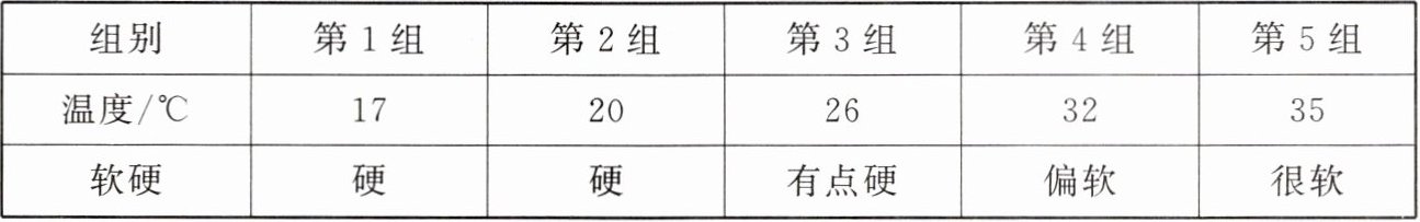 23. 柿子营养丰富,有清热润肺、生津止渴等功效。某科学兴趣小组对影响柿子成熟的因素进行了以下实验探究:选取品种、大小、色泽、软硬相同、成熟度相似的柿子若干个,分成5组,分别置于不透光的盒内,置于不同的温度环境下,三天后观察,结果如下:(柿子的成熟度越高越软)